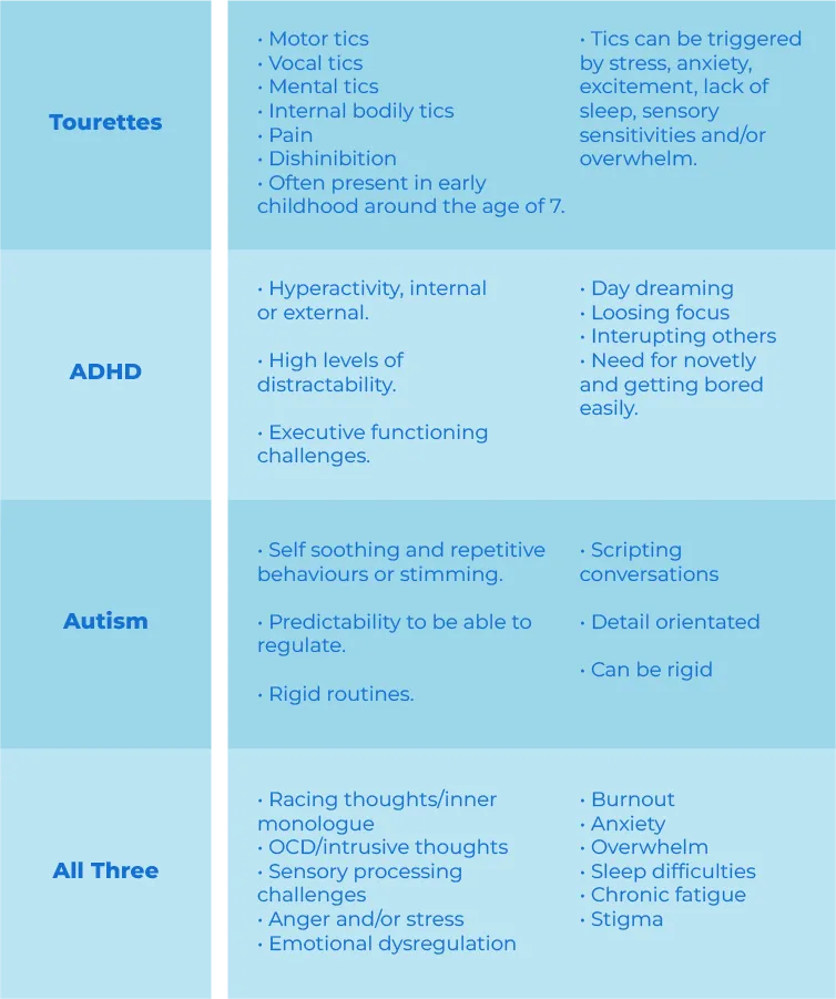 Tourette’s: may feel harder to manage when combined with the unpredictability of ADHD and the sensory/emotional demands of Autism.