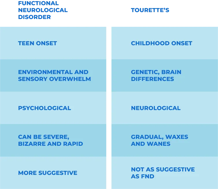 Tourette’s – neurological, begins in childhood, involuntary, brain-based.
